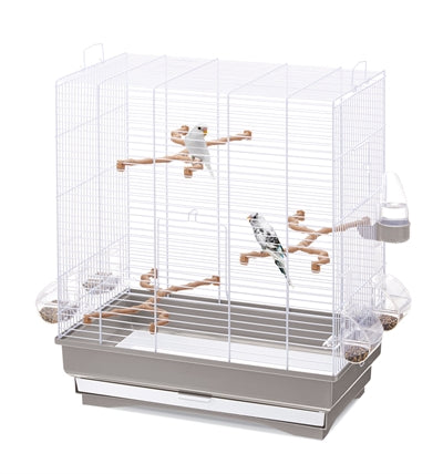 De Imac Vogelkooi Carlotta Taupe / Wit 50 x 30 x 56 cm is een praktische vogelkooi met zitstokken, voer- en drinkbakken en schuiflade, voor kleine vogels als kanaries, tropen en grasparkieten. Deze degelijke kooi is uitgevoerd in een moderne kleurstelling, namelijk taupe en wit, met witte tralies. De tralies aan de voor- en achterzijde zijn horizontaal, zodat de vogels de mogelijkheid hebben om te klimmen. De kooi is eenvoudig te verschonen door de schuiflade in de onderbak, die zorgt dat de bak gemakkelijk verschoond kan worden zonder dat de vogels kunnen ontsnappen. Indien je toch toegang wilt tot de dieren, kan dit door de deurtjes aan de voorkant en zijkant. De kooi wordt geleverd met drie organische gevormde zitstokken, vier voerbakjes en een drinkfontein.