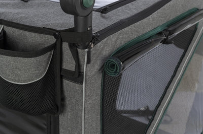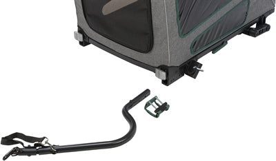 De Trixie Fietskar Grijs/Salie 62X80X92 cm is een hondenkar voor achter de fiets, gemaakt van water afstotend polyester, metaal, rubber en plastic. Neem jouw hond mee op een fietstocht met deze mooie kar! De kar is voorzien van een ophanging voor meer comfort en bevat een kussen met memory foam.